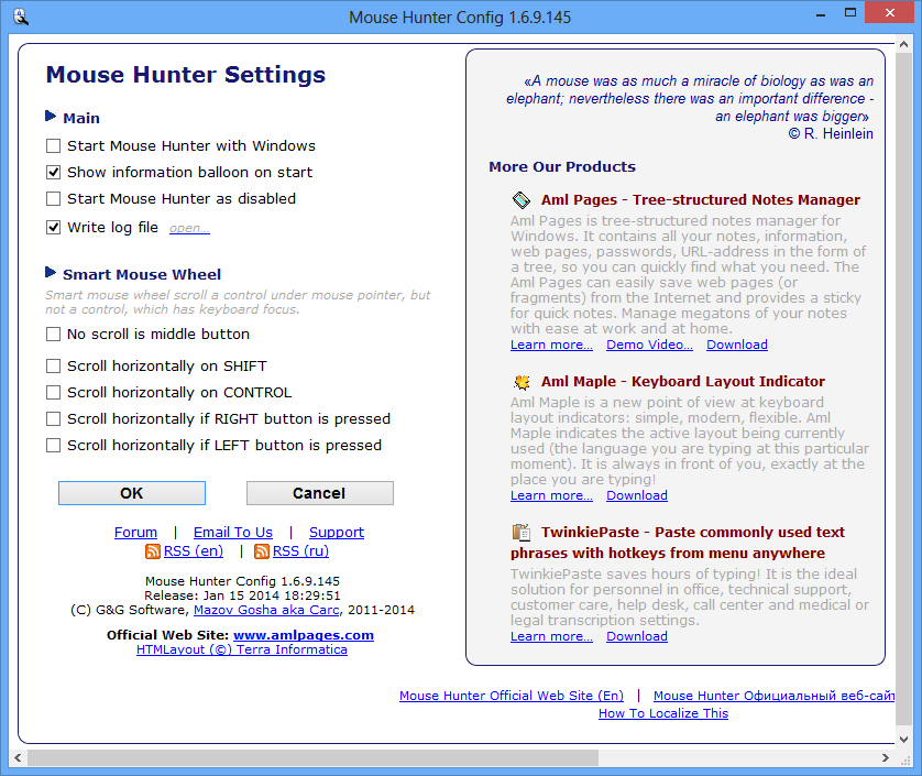 Mouse Hunter 1.7.2.149 — бесплатная утилита для точной настройки поведения колесика мыши в операционной системе Windows. Программа устраняет типичное поведение интерфейса, при котором прокрутка осуществляется не под курсором, а в активном элементе. Благодаря этому использование мыши становится более интуитивным и удобным.