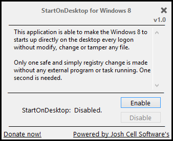 StartOnDesktop 1.0 — компактная портативная утилита, позволяющая при запуске Windows 8 обходить стартовый экран и сразу переходить на рабочий стол. Программа не вносит изменений в системные файлы, а лишь корректирует один параметр в реестре. Подходит для пользователей, желающих ускорить начало работы за компьютером.