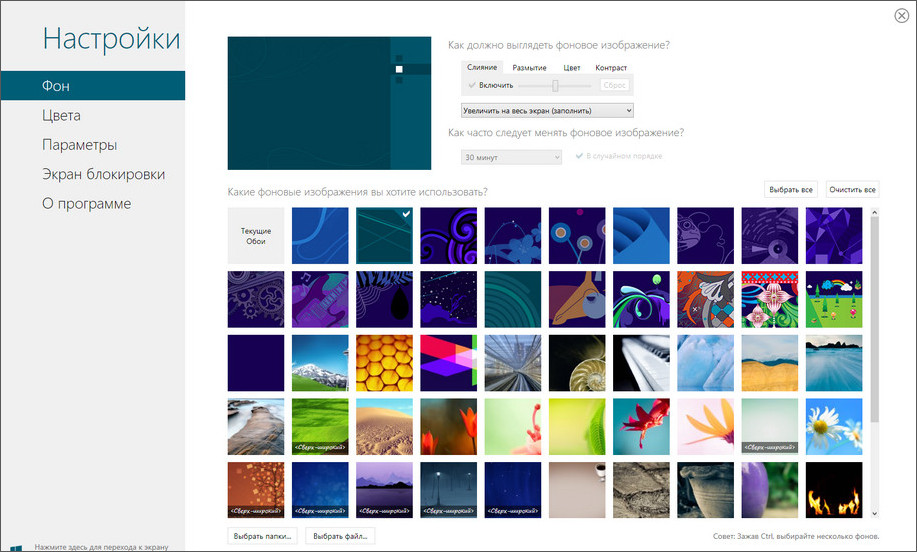 - Поддерживает автоматическую смену обоев через заданный интервал времени