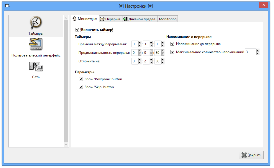 - Программа напоминает о необходимости сделать перерыв через заданные интервалы