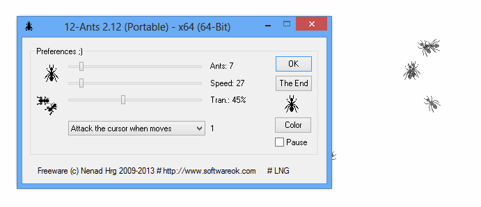 Использование программы предельно простое: после запуска исполняемого файла ants.exe активируются муравьи, которые сразу начинают перемещаться по экрану. Пользователь может открыть настройки через контекстное меню, вызываемое кликом по иконке в трее. Там доступно управление количеством, цветом, скоростью и прозрачностью ant. Также можно указать, как именно должны реагировать насекомые на движение курсора — преследовать его, убегать или игнорировать. Все изменения применяются мгновенно, без перезапуска утилиты. Благодаря минимальному потреблению системных ресурсов, 12-ants не влияет на производительность ПК.