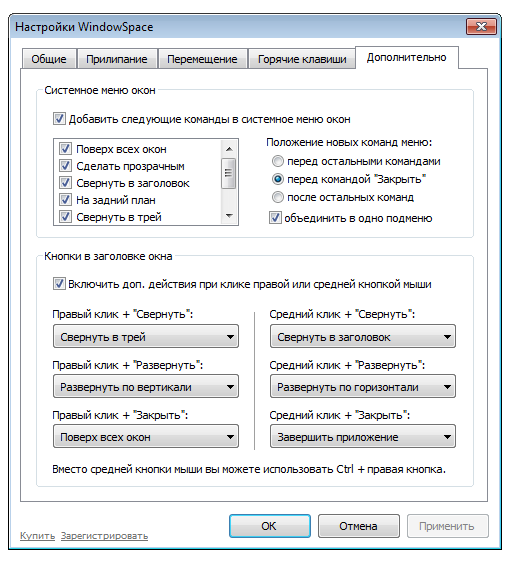 - Горячие клавиши для изменения положения и размера окон