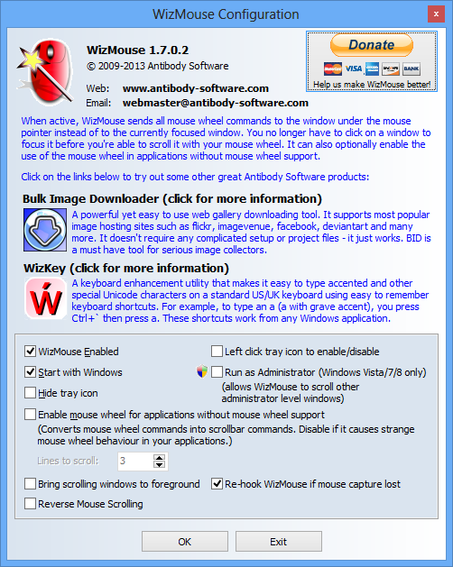 WizMouse разработана компанией Antibody Software как простое и эффективное решение для пользователей, сталкивающихся с ограниченной функциональностью скроллинга в стандартной конфигурации Windows. Программа работает в фоновом режиме и не требует сложных настроек. После установки она автоматически активирует технологию прокрутки под указателем мыши, что особенно полезно при использовании программ, которые изначально не поддерживают скроллинг без фокуса окна.