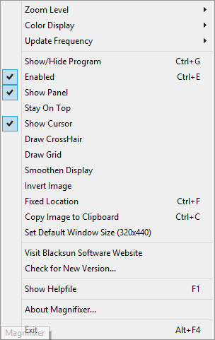 Magnifixer 10.2 — это легковесная и удобная утилита для увеличения изображения на экране, разработанная компанией Blacksun Software. Программа поддерживает русский язык и отлично подойдёт как пользователям с ослабленным зрением, так и специалистам, которым требуется точность при работе с мелкими деталями, например, дизайнерам или верстальщикам. Утилита позволяет увеличивать фрагмент экрана в районе курсора мыши, не закрывая и не мешая основные окна приложений.