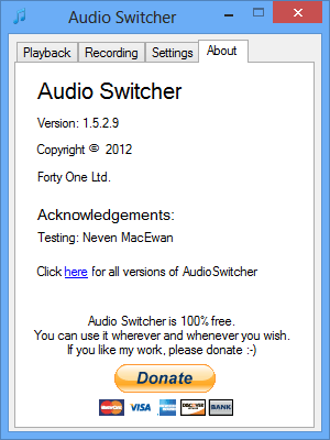 Audio Switcher 2.2.2.0 разработана Сианом Чэпменом и распространяется как бесплатное программное обеспечение. Она предназначена для пользователей ОС Windows, включая версии 7, 8.1, 10 и 11, поддерживая как 32-, так и 64-битные системы. Программа имеет минимальный размер — всего 1 МБ, что делает её одной из самых лёгких в своём классе. Audio Switcher не нагружает систему и работает фоном, обеспечивая быстрый доступ к выбору нужного аудиоустройства.