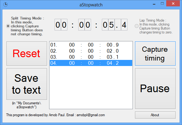 Использование программы предельно просто: после запуска .exe-файла перед пользователем появляется небольшое окно с цифровым табло и основными кнопками. При нажатии на Start начинается отсчёт времени с точностью до сотых долей секунды. При необходимости можно зафиксировать текущий результат с помощью кнопки Split, который сохранится в памяти приложения и затем будет перенесён в текстовый файл. По окончании серии замеров счёт можно сбросить, чтобы начать заново, не перезапуская саму программу. Такой подход особенно удобен при проведении тестов, спортивных упражнений или настольных игр, когда важно фиксировать промежуточные итоги без остановки основного хода времени.
