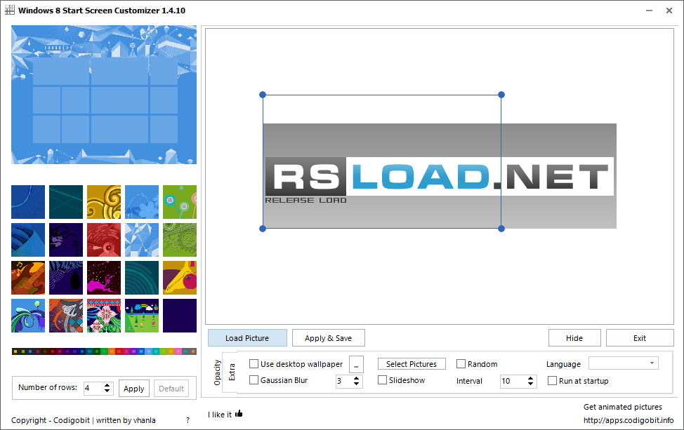 Windows 8 Start Screen Customizer 1.4.10 Beta — это компактная утилита, позволяющая персонализировать начальный экран операционной системы Windows 8 и выше, настраивая фон, прозрачность, цветовую схему и количество строк с плитками. Программа предлагает простой интерфейс и минимальный набор функций, необходимых для визуальной модификации стартового экрана. Благодаря легковесной структуре и отсутствию сложных зависимостей, утилита быстро запускается и не нагружает систему.