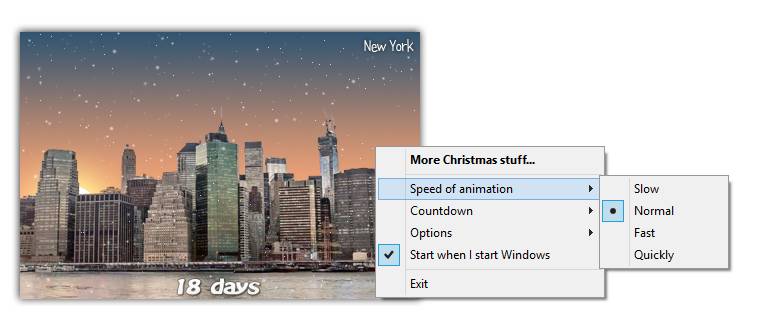 Christmas in New York 1.0 — лёгкая портативная программа, отсчитывающая дни до Рождества и демонстрирующая анимацию заснеженного мегаполиса. Приложение не требует установки и сразу после запуска начинает работать в фоновом режиме. Пользователи получают доступ к живой заставке с видами знаменитого города и обратным отсчётом до одного из самых тёплых праздников в году.