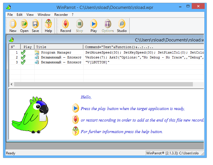 Использование WinParrot 2.1.3.3 не требует специальных навыков. Для начала записи достаточно нажать на кнопку в виде микрофона в интерфейсе приложения или использовать стартовую комбинацию, после чего программа начнёт фиксировать все действия. Завершить запись можно нажатием клавиши END на клавиатуре, что удобно при работе с полноэкранными приложениями. Сохранённые макросы отображаются в списке, откуда их можно запустить на воспроизведение с помощью кнопки Play. Каждый сценарий можно редактировать, комбинировать или использовать в различных ситуациях — от заполнения форм до автоматизации запуска программ.