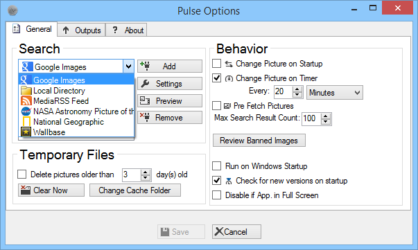 Утилита Pulse разработана с акцентом на простоту и функциональность. Программа автоматически подключается к таким популярным источникам изображений, как Google Images, National Geographic, Wallbase, MediaRSS Feed, а также NASA Astronomy Picture of the Day. Каждый из этих серверов можно настроить отдельно, выборочно включая или отключая, чтобы подстроить поток обоев под личные предпочтения. Pulse не создаёт лишнего мусора в системе — все загруженные изображения сохраняются в папке приложения, а при завершении сеанса могут быть удалены автоматически, если указано в настройках. Это делает использование программы чистым и безопасным для дискового пространства.