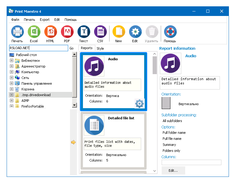 Программа Print Maestro разработана для автоматизации процесса анализа и документирования содержимого папок. Она позволяет не только формировать списки файлов, но и сохранять их в различных форматах, что делает её полезной как для домашнего, так и для корпоративного использования. Утилита поддерживает детальную настройку отчетов, включая фильтрацию по типам файлов, сортировку и вывод дополнительной информации, такой как дата изменения, размер и атрибуты. Благодаря поддержке множества форматов вывода, включая HTML, PDF, CSV и Excel, Print Maestro подходит для архивации данных и подготовки отчётов. Особое внимание уделено работе с мультимедийными файлами: для видео указывается продолжительность, кодек, разрешение, для изображений — ориентация, дата создания и миниатюры.