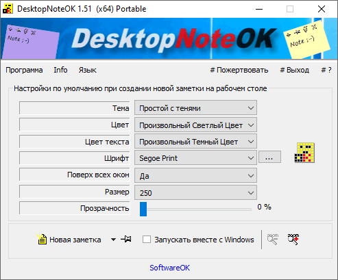 DesktopNoteOK 4.41 — легкая и удобная программа для создания заметок на рабочем столе с поддержкой русского языка и портативным режимом работы. Приложение не требует установки, работает на всех актуальных версиях Windows и позволяет быстро оформлять напоминания с настройкой цветов, прозрачности и размера. Благодаря интуитивному интерфейсу, даже новичок без труда освоит все функции.