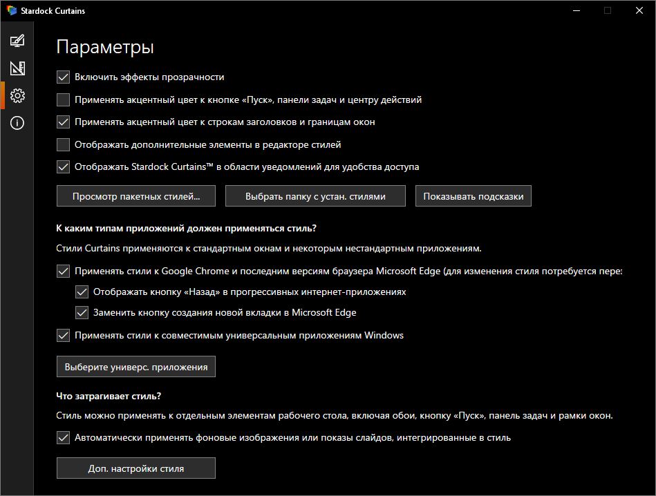 Curtains 1.19.1 — это мощное приложение для кастомизации внешнего вида операционной системы Windows, позволяющее создавать темы, настраивать интерфейс и применять продвинутые модификации с минимальными усилиями. Программа поддерживает детальное редактирование элементов оформления, включая цветовые схемы, стили панели задач, рамки окон и режимы отображения. С её помощью пользователь получает полный контроль над дизайном системы без необходимости вносить правки в системные файлы вручную.