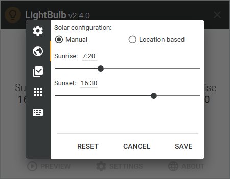 LightBulb — это программное решение, разработанное для пользователей, проводящих за монитором длительное время. Оно автоматизирует процесс изменения яркости и оттенков дисплея, учитывая текущее положение солнца относительно местоположения пользователя. Чтобы программа функционировала корректно, необходимо указать в настройках город или ближайший крупный населённый пункт. После этого LightBulb самостоятельно определяет время восхода и захода солнца, применяя соответствующие параметры экрана. Это позволяет минимизировать нагрузку на зрение, особенно в тёмное время суток.