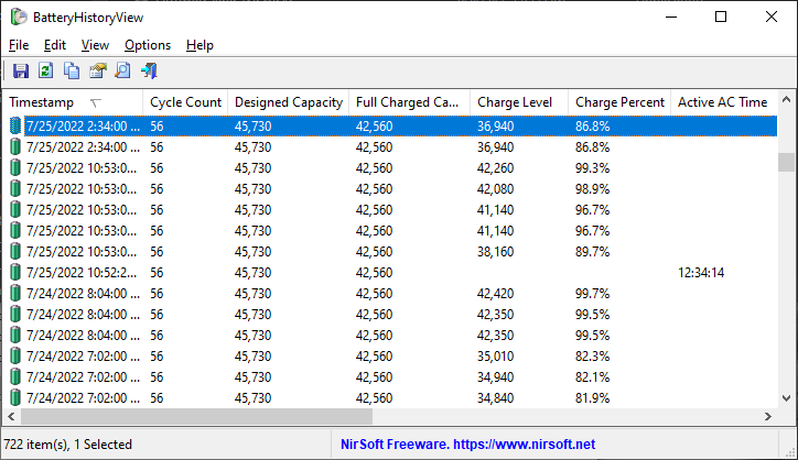 BatteryHistoryView разработан для извлечения и отображения данных об истории использования аккумулятора из системного файла SRUDB.dat, который используется операционными системами Windows 10 и 11 для хранения различных метрик производительности. Информация собирается автоматически самой системой, и пользователь может получить к ней доступ без необходимости в специальном оборудовании или драйверах. Программа показывает такие показатели, как временная метка, количество циклов, расчётная ёмкость, уровень заряда и процент износа батареи.