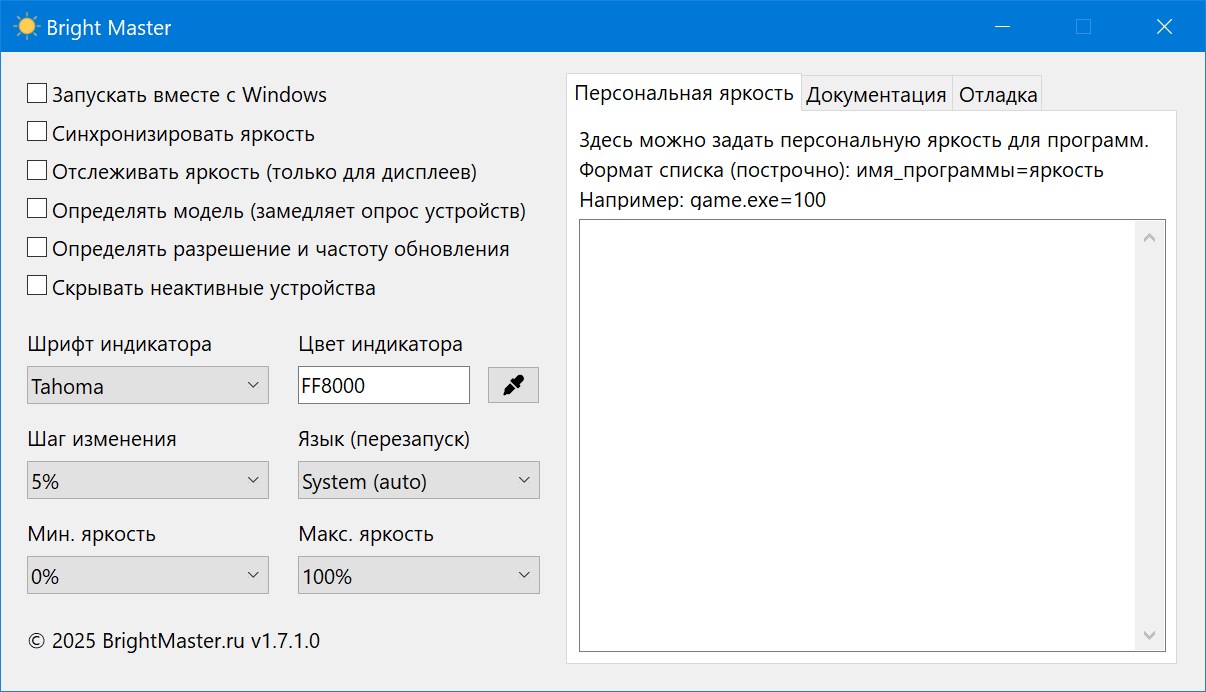 Bright Master 1.7.5.0 — это компактная и эффективная утилита для тонкой настройки яркости дисплеев на устройствах под управлением Windows. Программа поддерживает протокол DDC/CI и позволяет управлять яркостью мониторов, включая встроенные экраны ноутбуков, моноблоков и планшетов. Благодаря интуитивному интерфейсу и поддержке русского языка, Bright Master подойдёт как обычным пользователям, так и профессионалам, которым важна точная регулировка освещения экрана.