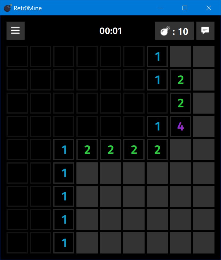 Управление в Retr0Mine интуитивно понятно и не требует времени на изучение. Левый клик открывает клетку, правый — помечает мину, а комбинации клавиш позволяют быстро перезапустить уровень или включить полноэкранный режим. Настройки доступны через простое меню, где можно выбрать количество мин, размер сетки, включить или отключить звуковое сопровождение. Тем, кто любит темный интерфейс, будет приятно, что он включён по умолчанию, но также доступны и другие цветовые схемы. Игра автоматически сохраняет текущий прогресс, что позволяет в любой момент закрыть программу и продолжить позже.