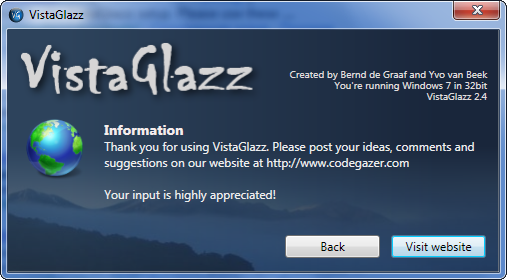 Программа VistaGlazz v2.4 — это компактная утилита, позволяющая без сложных манипуляций изменять системные файлы Windows Vista для применения сторонних тем оформления и настройки внешнего вида интерфейса. Она даёт возможность редактировать тему Aero, включать прозрачность на максимизированных окнах и легко управлять стилями. Утилита совместима с 32- и 64-битными версиями операционной системы и проста в использовании.