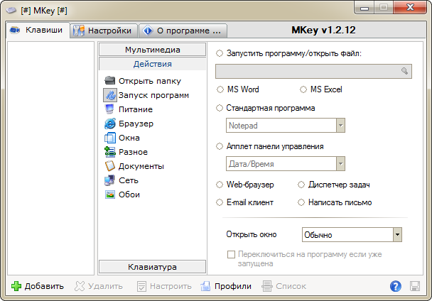 MKey 1.3.5 Final — это функциональный софт для тонкой настройки клавиш на мультимедийных и обычных клавиатурах. Программа позволяет переназначить кнопки, настроить макросы, управлять приложениями и системными функциями, включая громкость, запуск программ и работу с проводником. Скачать утилиту можно без сложных шагов, она совместима с различными версиями Windows и поддерживает русский язык интерфейса.