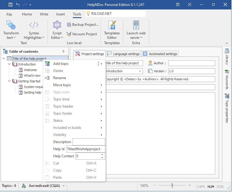 Программа занимает около 69 МБ на жёстком диске и совместима с операционными системами Windows 7, 8.1, 10 и 11, включая 32- и 64-битные версии. Лицензия распространяется как ShareWare, при этом активация HelpNDoc возможна через встроенный кряк, что упрощает использование без необходимости ввода лицензионного ключа. Несмотря на английский язык интерфейса, логичная структура меню и подсказки позволяют быстро освоить основные функции. Для тех, кто ищет надёжный инструмент создания документации с расширенными возможностями, HelpNDoc Personal — оптимальный выбор.