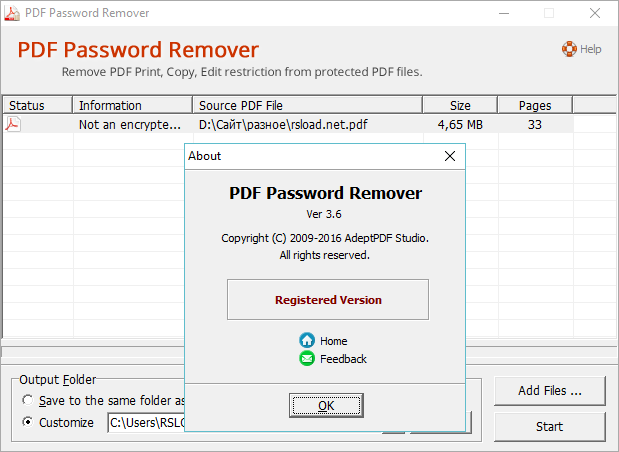 Adept PDF Password Remover 3.70 — это инструмент для снятия защиты с PDF-документов, заблокированных паролем. Программа позволяет обойти ограничения на редактирование, копирование и печать, восстановить доступ к файлам, созданным в программах Adobe Acrobat и других редакторах PDF. Поддержка популярных версий формата делает её практичным решением для пользователей, сталкивающихся с защищёнными документами.