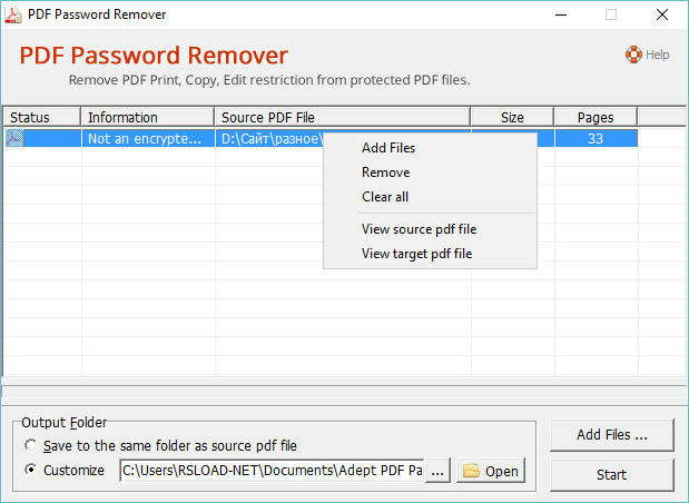Использование Adept PDF Password Remover не вызывает затруднений даже у новичков. После запуска приложения нужно добавить защищённый PDF-файл через интерфейс программы. Далее начинается автоматический процесс обработки: утилита определяет тип шифрования и снимает все ограничения. Результат — полностью открытый PDF-документ, доступный для редактирования, копирования и печати. Сохранённые метаданные, ссылки и изображения остаются без изменений, что особенно важно при работе с официальными или учебными материалами. Программа поддерживает массовую обработку, позволяя загружать несколько файлов одновременно, что значительно ускоряет рабочий процесс.