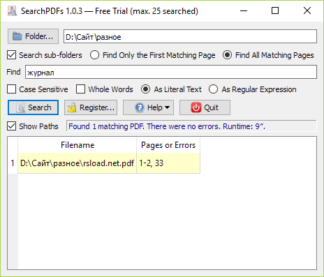 Пользоваться программой предельно просто: достаточно указать путь к папке с PDF-файлами, выбрать режим поиска — по текущей директории или с охватом подпапок. Далее пользователь определяет, нужно ли искать текст на первой странице или по всему содержимому документа. В соответствующем поле вводится искомое слово или фраза. После нажатия кнопки поиска программа начинает анализ файлов и возвращает список совпадений с пометкой, на каких страницах они обнаружены. Например, если ввести запрос «журнал», результат покажет, что слово встречается на страницах 1, 2 и 33 в конкретных файлах. Поиск осуществляется быстро благодаря оптимизированному алгоритму обработки PDF-структур.