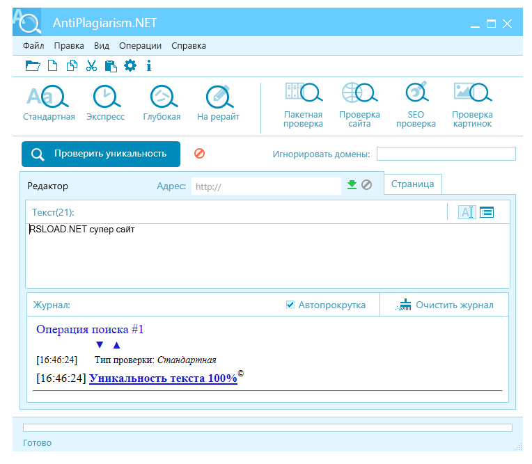 Использование AntiPlagiarism NET предельно простое: после запуска приложения нужно добавить текст или загрузить файл, затем запустить проверку. Программа начнёт сканирование интернета, используя несколько поисковых систем одновременно для более полного охвата. Все найденные совпадения будут выделены цветом, а в отчёте отобразятся прямые ссылки на источники. Пользователь может игнорировать правильно оформленные цитаты, настроить порог срабатывания и работать с несколькими документами в пакетном режиме. Результаты проверки легко экспортировать в разные форматы, что удобно для последующего анализа или представления. Для активации не требуется сложной регистрации — ключ поставляется в комплекте, что упрощает процесс настройки. Даже если вы ищете бесплатный инструмент для проверки контента, данная сборка позволяет обойтись без подписок и платных сервисов.