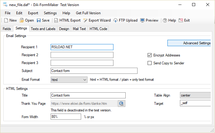 DA-FormMaker 4.18.1 — это приложение для создания HTML-форм разной сложности без необходимости знания программирования. Инструмент автоматически генерирует валидный код, подходящий для использования на современных сайтах. Поддержка экспорта, встроенный FTP-менеджер и функция предварительного просмотра делают работу с формами максимально простой и эффективной.
