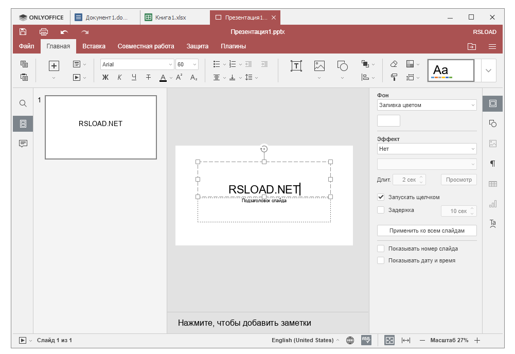 ONLYOFFICE — это современное офисное приложение, разработанное для эффективной работы с документами, электронными таблицами и презентациями. Программа поддерживает широкий спектр форматов, включая DOCX, XLSX, PPTX, ODT, ODS, ODP, а также PDF, HTML, EPUB и другие. Интерфейс выполнен на базе вкладок, что упрощает навигацию между открытыми файлами. Пользователи могут работать с несколькими документами одновременно в одном окне, не переключаясь между разными приложениями.