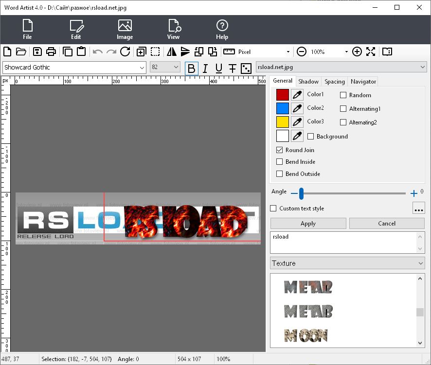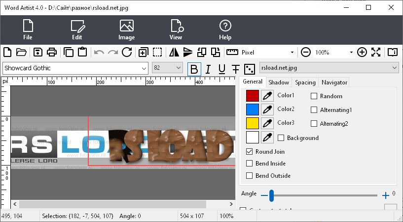 Word Artist 4.0 предлагает не только базовые функции добавления текста, но и расширенные параметры визуального оформления, включая цвет заливки, прозрачность и угол наклона теней.