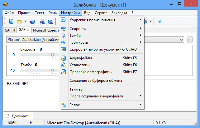 - Гибкие настройки синтеза речи: ударение, паузы, тональность, скорость чтения