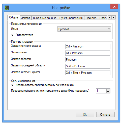 - Поддерживается работа с горячими клавишами, которые можно настраивать под себя, включая функции для PrintScreen, Alt+PrintScreen и Ctrl+PrintScreen.
