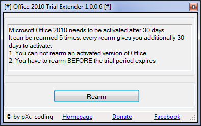 Продукт Microsoft Office 2010 изначально предусматривал возможность продления пробного периода с помощью команды Rearm, однако выполнение этой операции требовало знания командной строки и определённых навыков. Утилита Office 2010 Trial Extender упрощает этот процесс до минимума, предоставляя пользователю графический интерфейс с одной кнопкой. Разработчик pXc-codin реализовал функционал так, что для продления срока достаточно просто запустить программу и нажать на команду «Rearm». Это значительно ускоряет доступ к полному функционалу офисного пакета на более длительный срок.