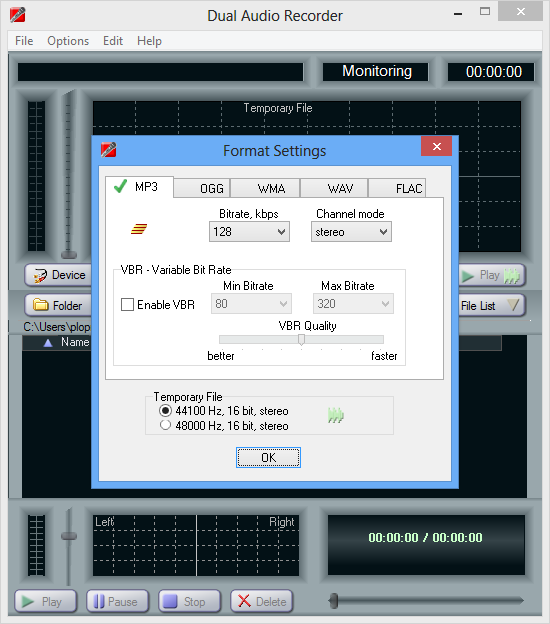 - Запись в форматах MP3, WAV и временных несжатых файлах