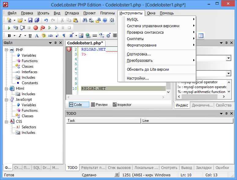 Отдельного внимания заслуживает поддержка PHP в CodeLobster, которая включает анализ структуры кода, навигацию по функциям и классам, а также интеграцию с серверными окружениями.