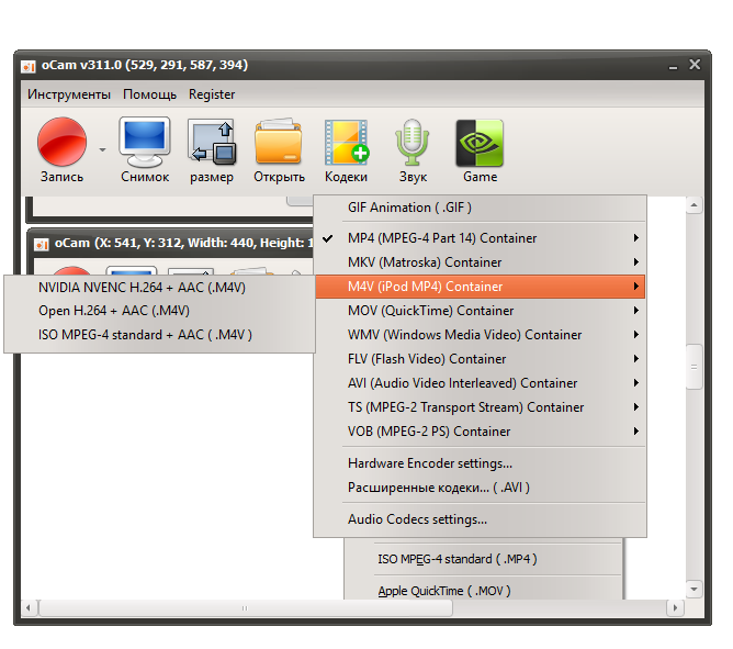 - Поддержка записи звука и видео одновременно с настройкой кодеков