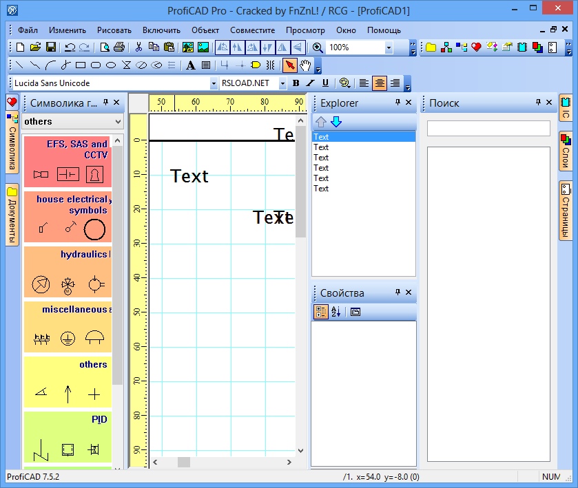 Работа с ProfiCAD не требует глубоких знаний в области автоматизированного проектирования. Интерфейс организован логично: слева расположена панель с библиотекой компонентов, а рабочая зона находится в центре. Пользователь может перетаскивать элементы на холст, соединять их линиями, добавлять пояснительные надписи и корректировать параметры. Все действия выполняются мышью или через контекстные меню. Благодаря поддержке на русском языке, даже новичок быстро разберётся в функционале. Программа позволяет настраивать масштаб, привязку к сетке и стиль линий, что повышает точность чертежей.