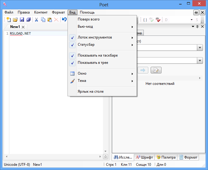 Использование Poet не требует специальных навыков — после запуска программа открывается с чистым листом, готовым к вводу текста. Пользователь может открыть несколько файлов в виде вкладок, что упрощает переключение между документами. Поиск осуществляется через стандартное окно поиска, где можно включить подсветку всех вхождений, а также использовать замену с поддержкой регулярных выражений. Веб-поиск и перевод активируются прямо из контекстного меню, что экономит время. Дополнительно доступна статистика по документу — количество символов, слов, строк и абзацев, что полезно при написании текстов с ограничением по объёму. Поддержка орфографии работает на русском и английском языках, помогая избежать досадных ошибок.