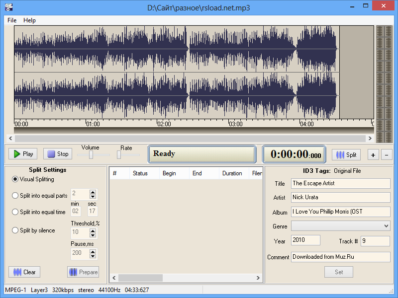 - Разделение аудиофайлов вручную или автоматически на равные части