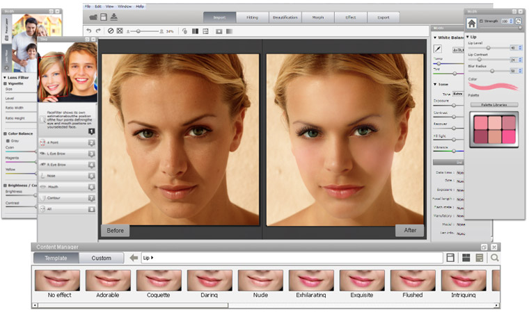После запуска программы пользователь может импортировать фотографию и сразу приступить к редактированию. Интерфейс разделён на логические панели, где доступны настройки макияжа, формы лица, цвета и света. В один клик применяются заранее подготовленные пресеты, что ускоряет процесс при необходимости массовой обработки снимков. Режим предварительного просмотра позволяет сравнивать оригинальное и отретушированное изображение, а точечная коррекция даёт контроль над каждым элементом портрета.