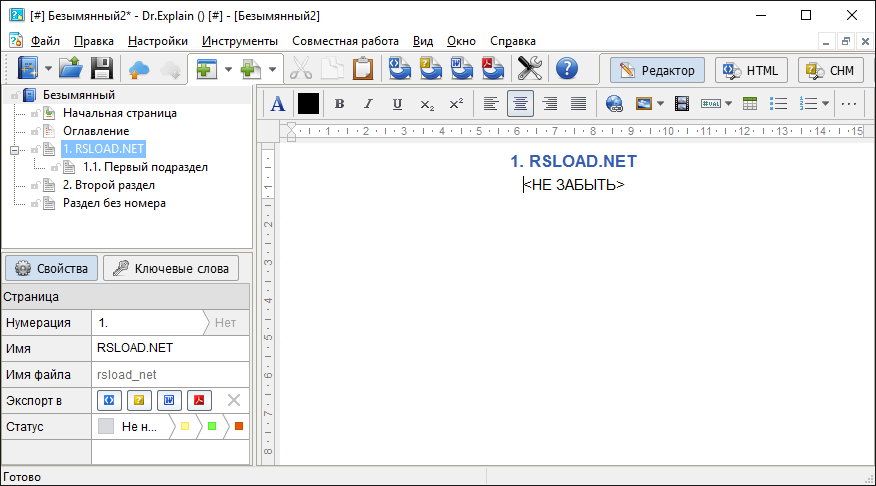- Экспорт в HTML, PDF, CHM и RTF с настройкой стилей и шаблонов