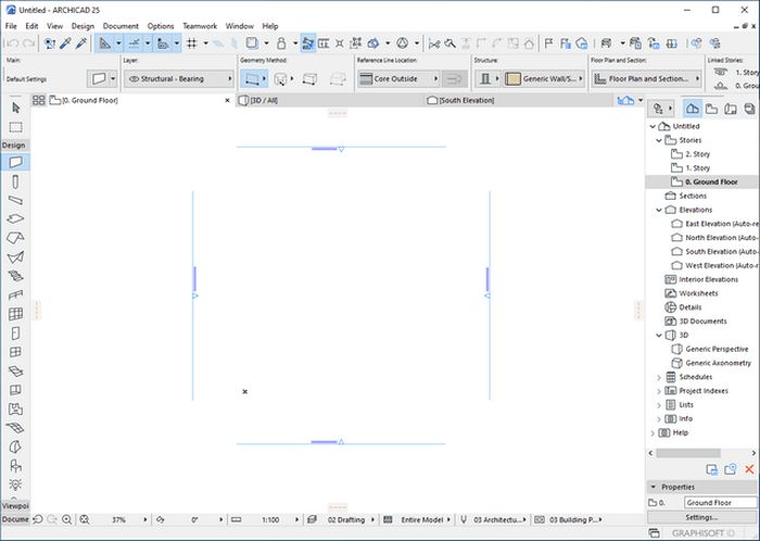 ArchiCAD 27 Build 4001 представляет собой комплексное решение для архитектурного моделирования, разработанное компанией Graphisoft. Программа поддерживает как двухмерное, так и трёхмерное проектирование, позволяя визуализировать здания на всех этапах разработки. Интерфейс интуитивно понятен: основные инструменты расположены в панелях, а навигатор в правой части окна позволяет быстро переходить между этажами, фасадами и чертежами. Поддержка русского языка упрощает освоение функционала, особенно для новичков в BIM-технологиях.