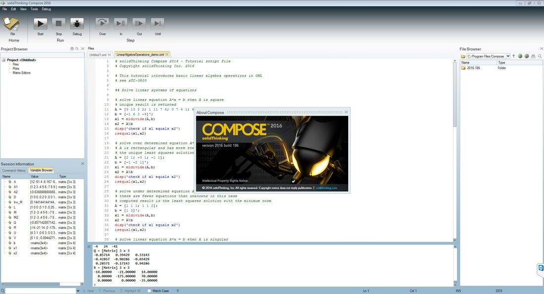 solidThinking Compose 2017.3.3815 представляет собой вычислительную среду, построенную на основе высокоуровневого языка, ориентированного на матричные операции и численные методы. Программа разработана компанией solidThinking и ориентирована на инженеров, математиков и научных сотрудников, которым необходим инструмент для моделирования, анализа и обработки данных. Архитектура приложения позволяет эффективно решать широкий спектр задач, включая линейную алгебру, статистику, обработку сигналов и оптимизацию систем.