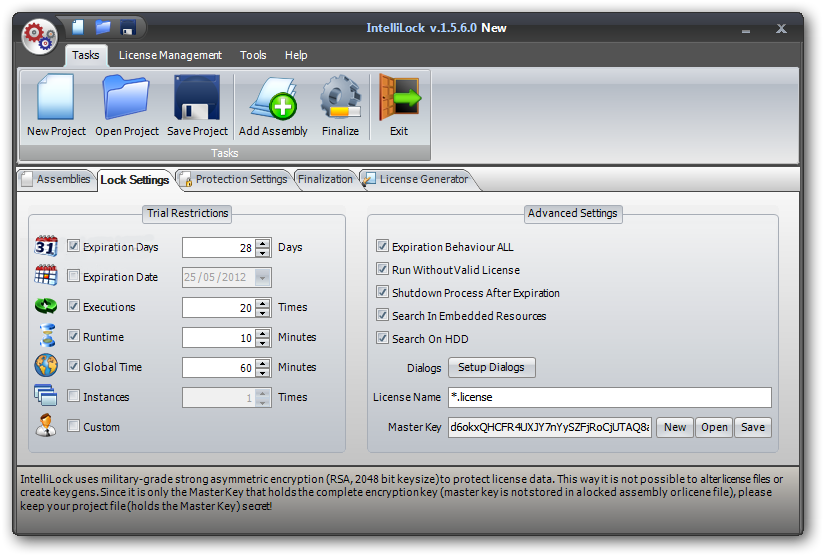 Работа с IntelliLock начинается с добавления .NET-сборок в проект. Пользователь может загрузить EXE, DLL или XAP-файлы, установить нужный порядок обработки и выбрать целевой каталог для выходных файлов. Программа позволяет блокировать сборки отдельно или объединять их в единый защищённый пакет. Конфигурация лицензирования включает задание срока действия, ограничения по количеству запусков, времени использования или дате окончания. Все параметры реализуются за счёт внедрения дополнительного кода, не затрагивающего исходную логику приложения. Интеграция с Visual Studio ускоряет процесс защиты и делает его частью рабочего цикла разработки.