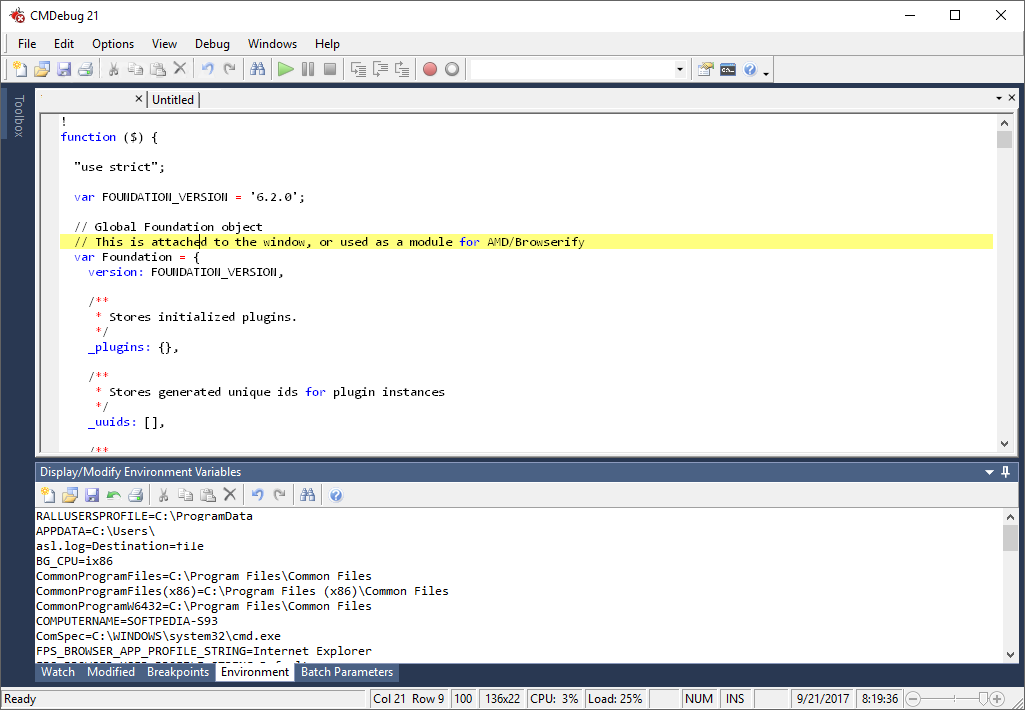 CMDebug представляет собой графическую среду разработки с отладчиком, ориентированную на работу с пакетными файлами и сценариями на языке TCC. Программа построена на базе среды Take Command IDE и обеспечивает высокую совместимость с существующими CMD-скриптами. Интерфейс приложения разделён на функциональные области: редактор кода и панели для просмотра переменных, точек останова и параметров выполнения. Благодаря этому разработчик может в реальном времени отслеживать состояние скрипта, выявлять ошибки и оптимизировать логику выполнения.
