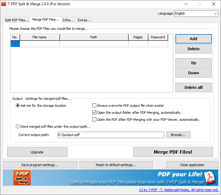 7-PDF Split & Merge 3.1.0.164 — это легковесная утилита для разделения и объединения PDF-файлов, ориентированная на простоту и скорость обработки документов. Программа подходит как для повседневных задач, так и для профессионального использования, обеспечивая сохранение исходного качества текста, графики и форматирования. Несмотря на отсутствие встроенного русификатора, интерфейс интуитивно понятен и не требует глубоких знаний для работы с файлами.
