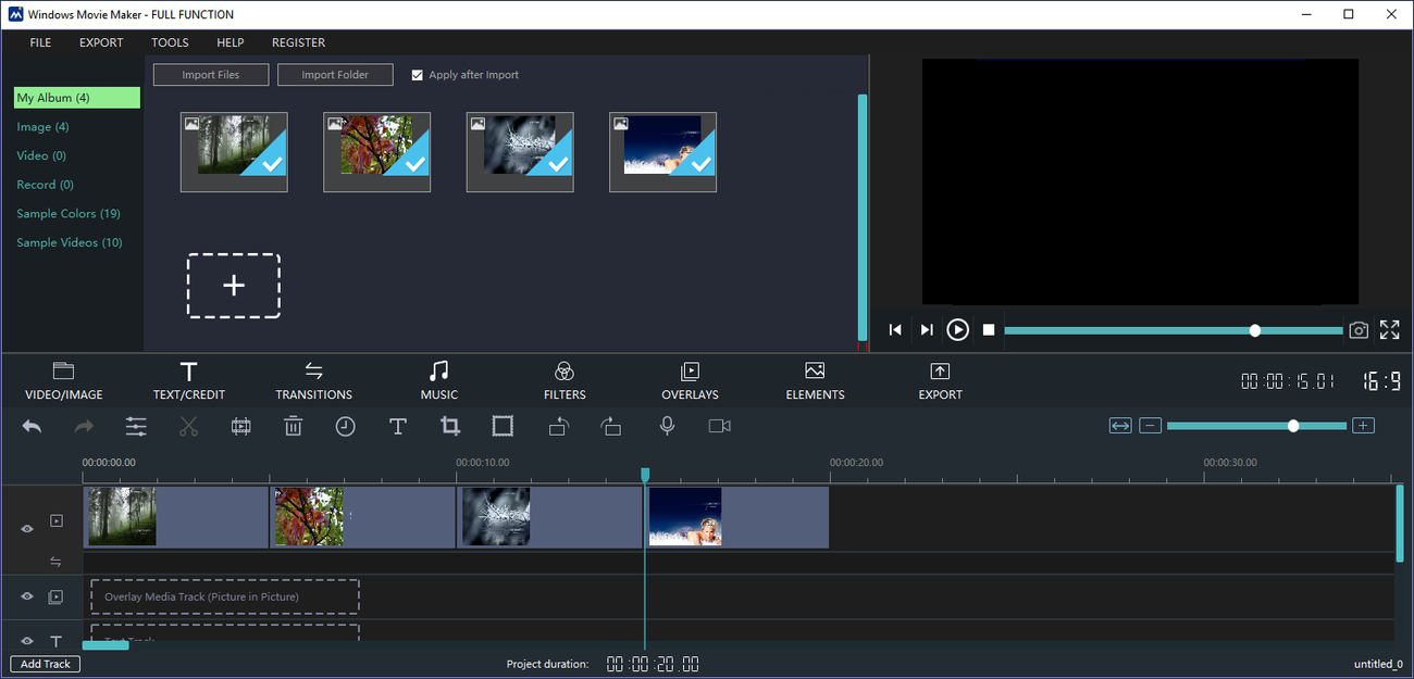 Работа с программой начинается с добавления исходных материалов — фотографий, видеоклипов и аудиодорожек — в проект. Они отображаются в виде миниатюр в верхней части интерфейса, а на временной шкале можно устанавливать длительность каждого фрагмента, настраивать порядок воспроизведения и добавлять эффекты. Панель инструментов предоставляет доступ к визуальным эффектам, переходам, анимации текста, а также функциям коррекции цвета и громкости. Предварительный просмотр в отдельном окне позволяет в режиме реального времени оценивать результат редактирования.
