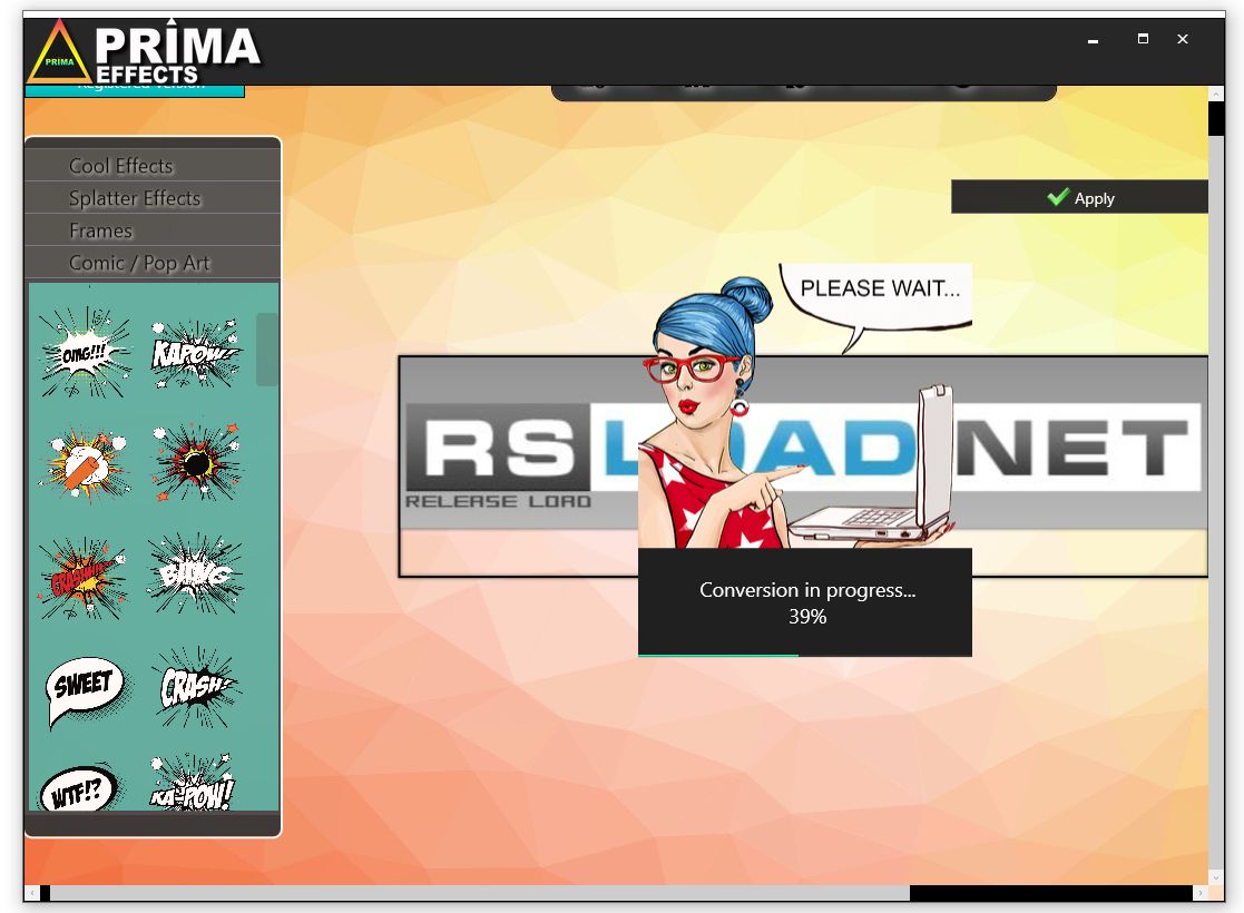 Использование программы начинается с загрузки изображения через центральную кнопку в главном окне. После этого доступны базовые инструменты коррекции: настройка яркости, контраста, масштаб и обрезка. Далее пользователь переходит к выбору эффектов, которые сгруппированы по категориям — Cool Effects, Splatter Effects и Frames. Каждый фильтр можно просмотреть в реальном времени, что упрощает выбор подходящего стиля. После применения эффекта можно дополнительно добавить графические элементы в стиле комиксов. Финальное изображение экспортируется в формате PNG, JPEG или GIF, в зависимости от целей использования. Программа обрабатывает файлы быстро, хотя скорость зависит от производительности компьютера. Портативная версия позволяет использовать Prima Effects на любом ПК без установки, что делает её удобной для мобильного использования.