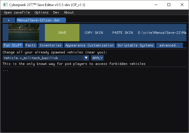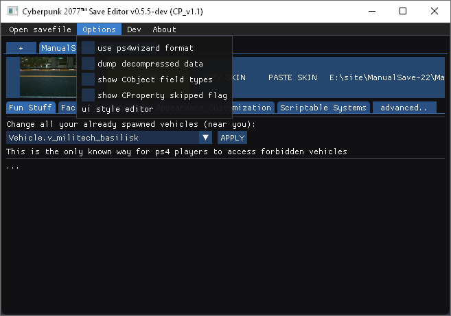 Cyberpunk 2077 Save Editor 0.5.5 Dev — это инструмент для редактирования игровых сохранений в популярной RPG от CD Projekt Red. Программа позволяет изменять параметры персонажа, предметы в инвентаре, статус квестов и другие данные без риска для оригинальных файлов игры. Благодаря простому, но функциональному интерфейсу, пользователи могут легко настраивать процесс прохождения под свои предпочтения, используя собственные чит-коды.